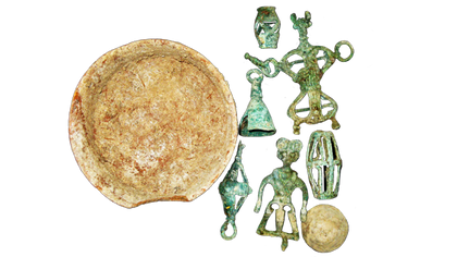 Eine der Bronzefiguren, die im antiken Grab gefunden worden sind.