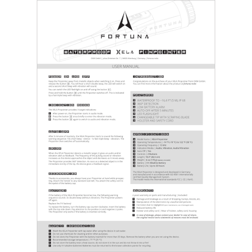 The FORTUNA Pinpointer XELA is a handheld metal detector for finding small metal items. The Pinpointer simplifies the detection of coins, keys, wedding rings or even historical artifacts during treasure hunts and protects these objects from scratches and damage caused by excavation tools.